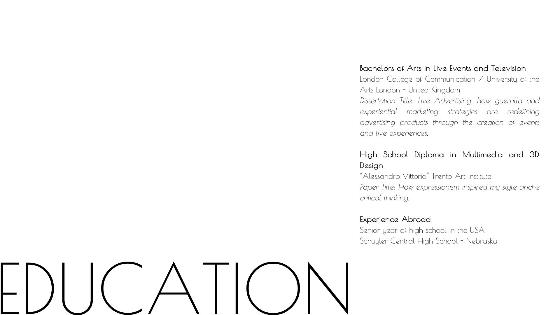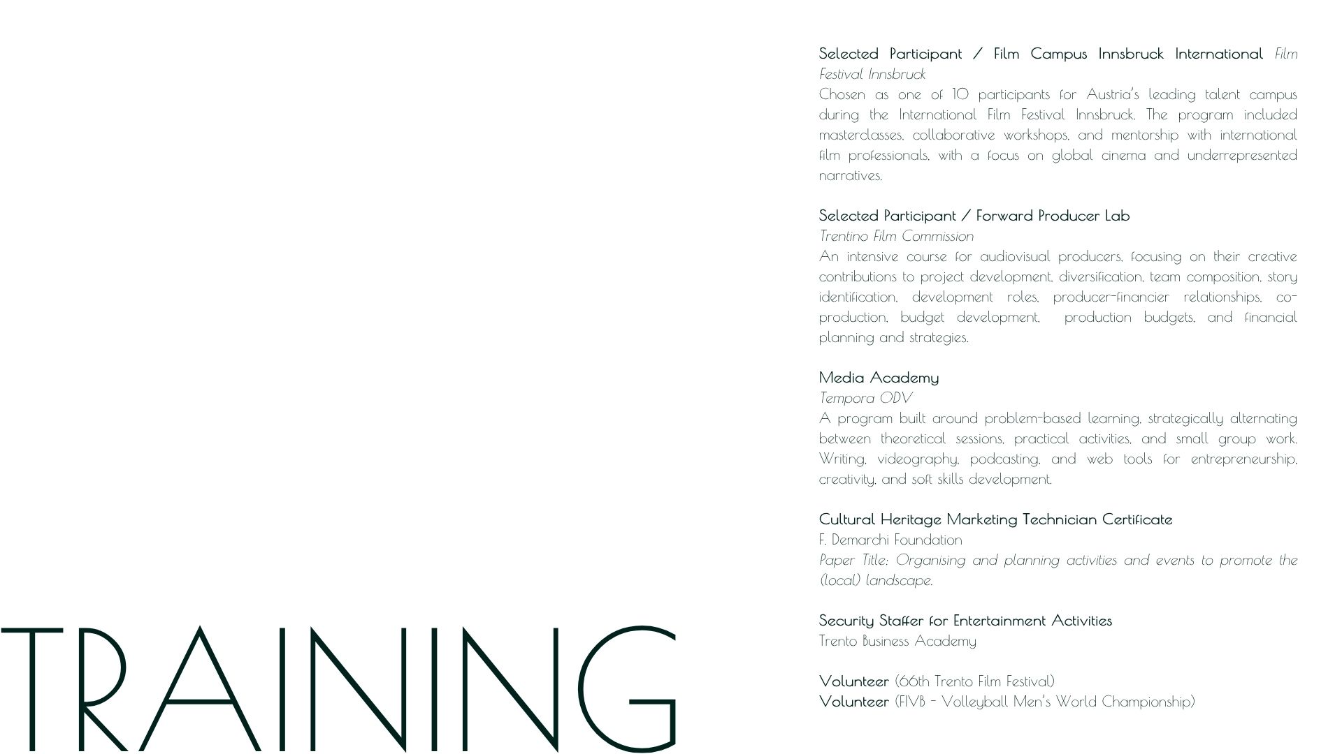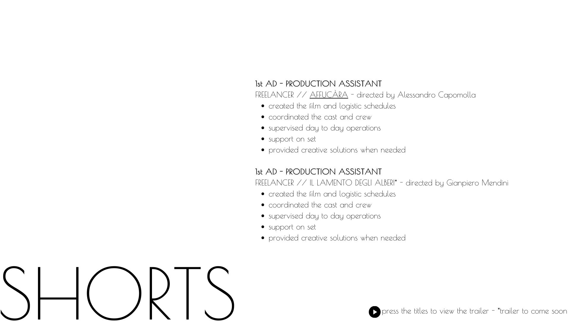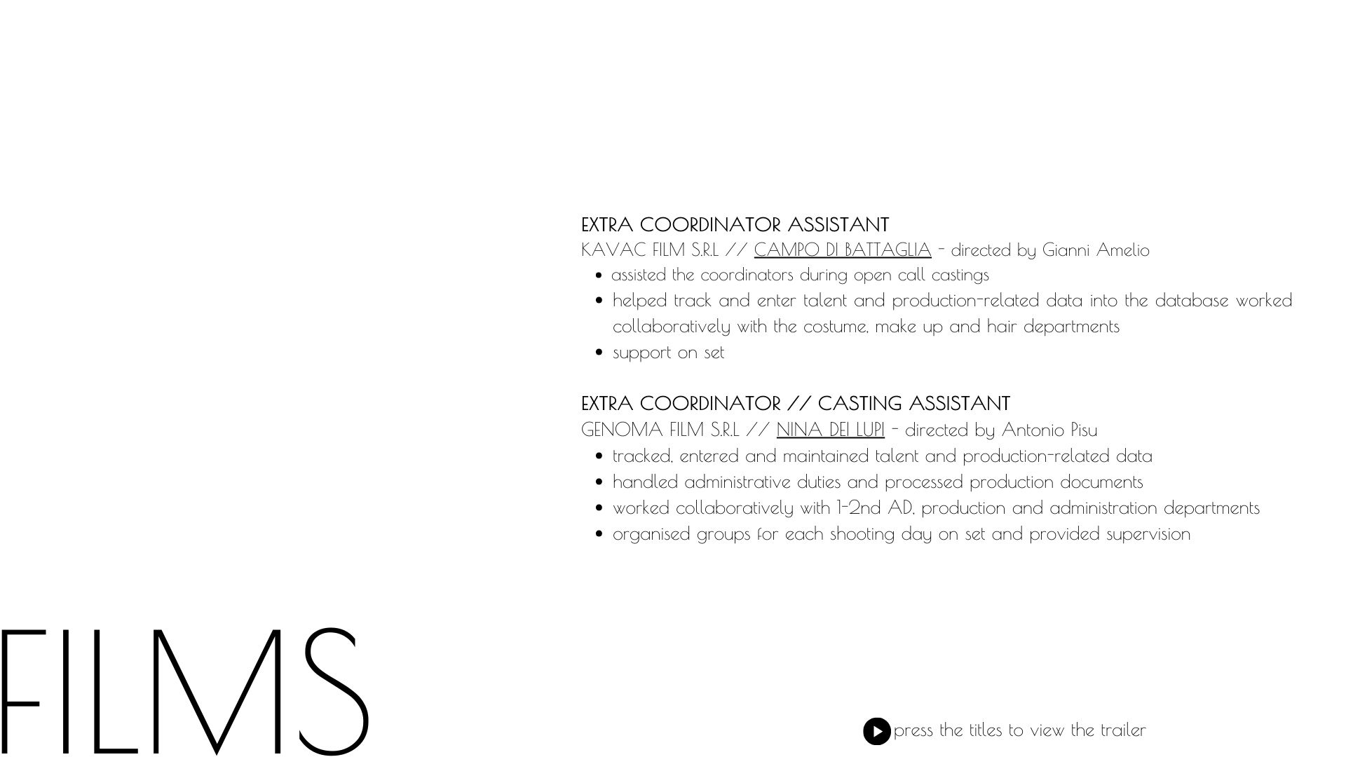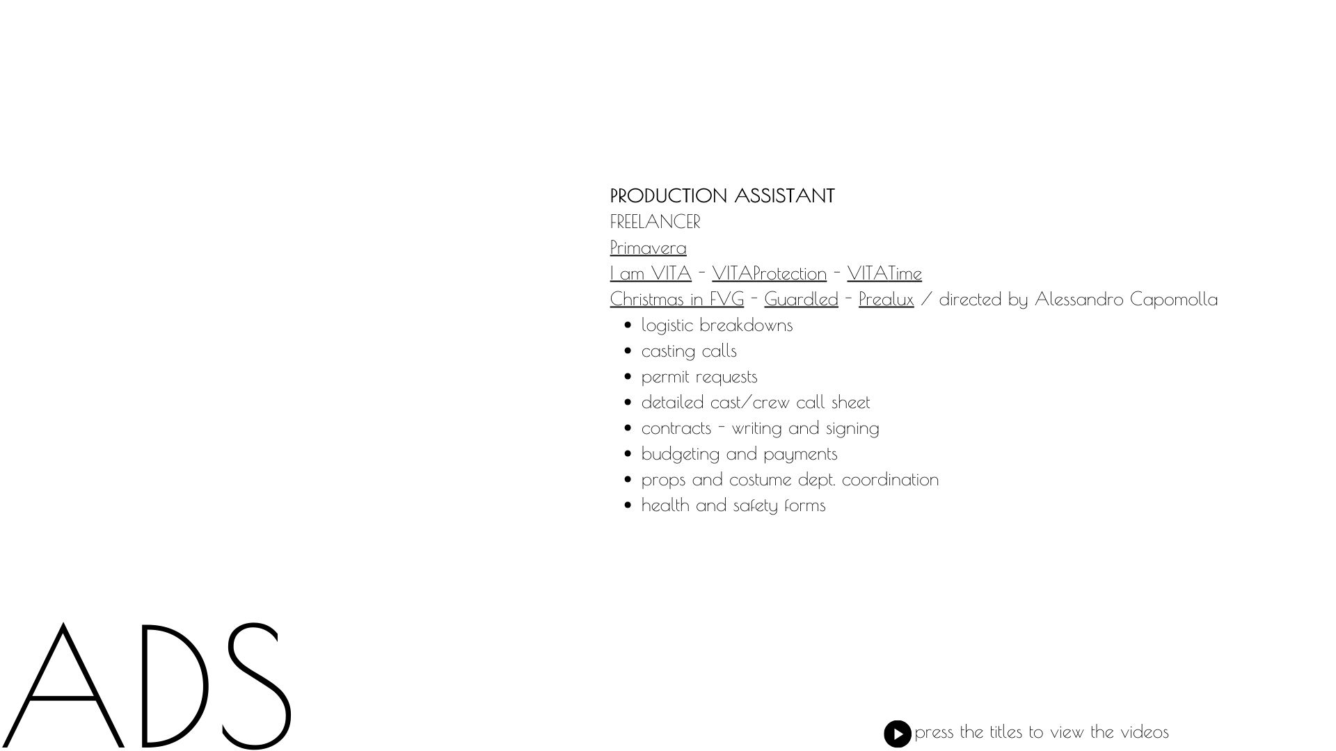 Hello and welcome to my website. Here you’ll find my portfolio and the opportunity to get in touch with me. You can also book one – or all – of my services available within the film, tv or event fields. Thanks for visiting!